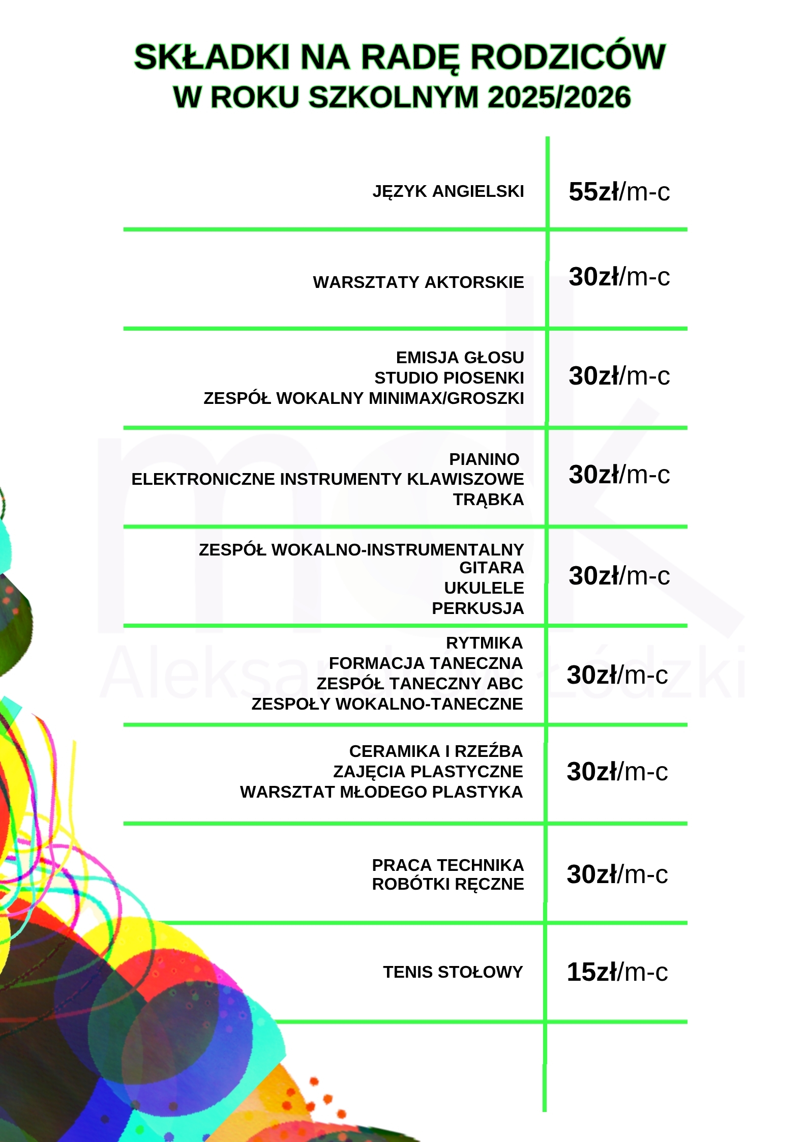 Zgodnie z Uchwałą nr II/2025/2026 podjętą dnia 29.09.2025 r. przez Radę Rodziców przy Młodzieżowym Domu Kultury im. Grzegorza Pintery w Aleksandrowie Łódzkim