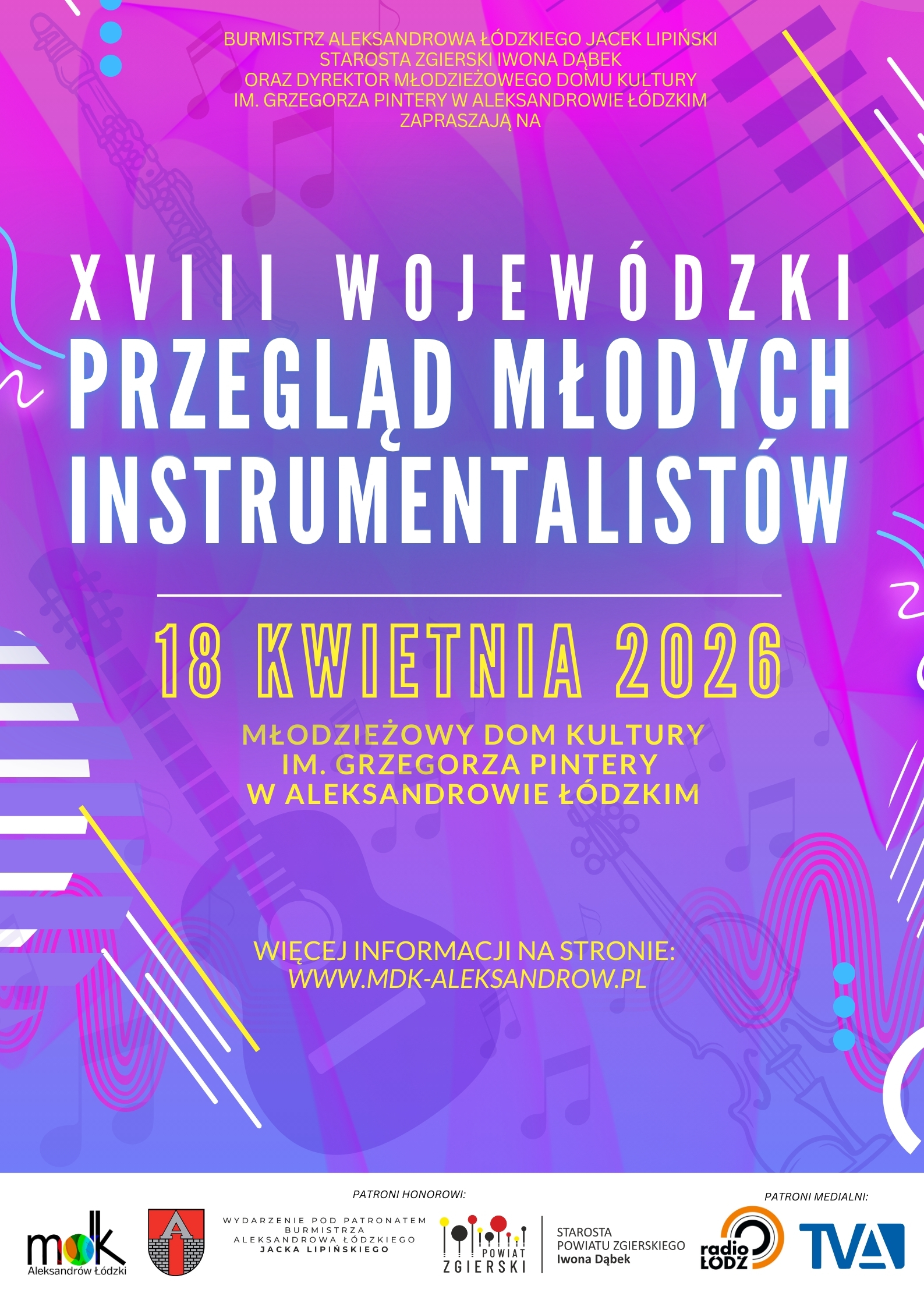 18 kwietnia 2026 zapraszamy do udziału w XVIII edycji Wojewódzkiego Przeglądu Młodych Instrumentalistów organizowanego przez Młodzieżowy Dom Kultury im. Grzegorza Pintery w Aleksandrowie Łódzkim!